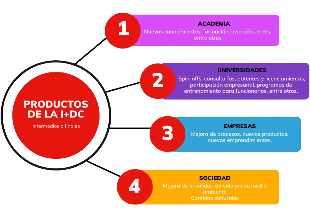 Probablemente estos productos no difieren significativamente de los productos de un proceso de I+D tradicional. Sin embargo, la diferencia reside en la utilidad que estos productos tienen para la sociedad y por ende como son adoptados por ésta. Muchos productos de transferencia actualmente generados por las universidades no llegan más allá de su creación debido a que no son de interés del sector empresarial, social o gubernamental. La I+Dc debería dar lugar a productos que tengan asegurada su adopción por parte de los stakeholders, ya que ellos serán participes de su desarrollo.